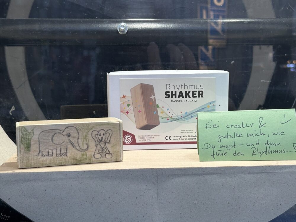 Hergestellt in einer Behindertenwerkstatt erhaltet Ihr einen „Bausatz“, den Ihr gaaaaaaaanz einfach zu einem Rhythmus-Shaker zusammenbauen könnt. Wenn er dann fertig ist, könnt Ihr ihn selbst kreativ bemalen – und schon kann man „Rhythmus“…