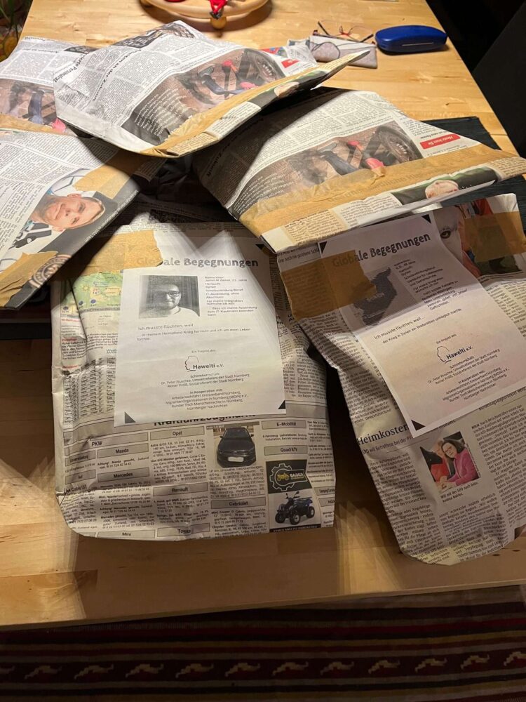 UND auf dem Bild seht Ihr Zeitungstaschen mit einem „Fehler“, die wir nun mit dem geschredderten Papier befüllt haben und die uns beim Versand dann zum Schutz von Ware dienen…