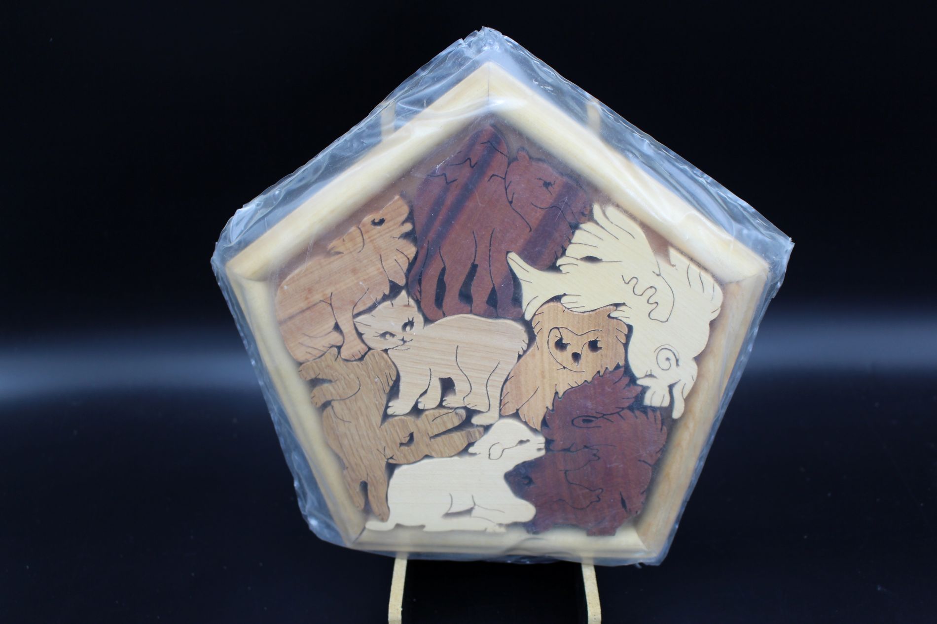 Ein Holz-Puzzle mit 8 Holztieren aus Naturhölzern in einem Holzrahmen